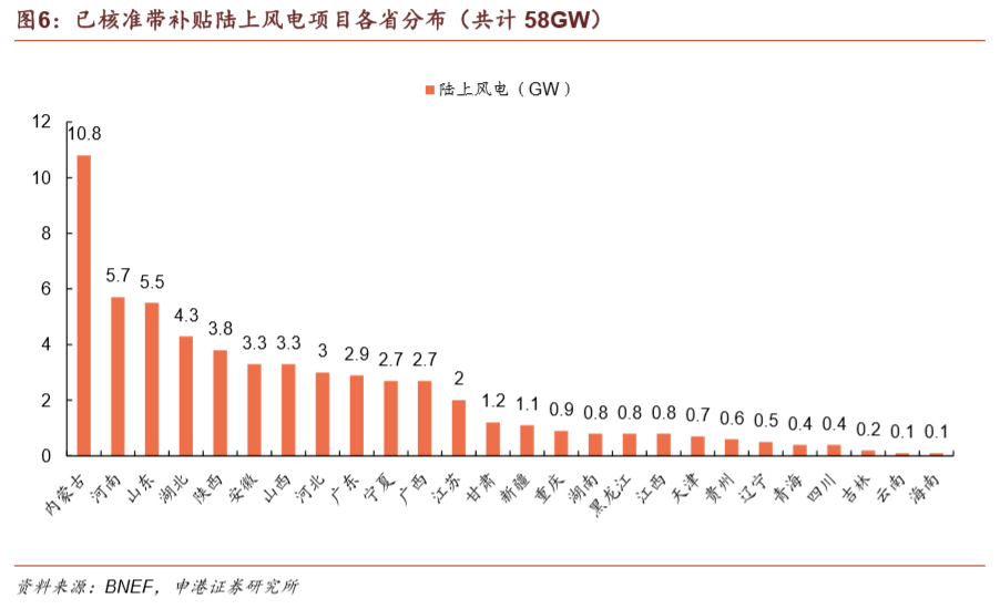 內(nèi)蒙古脫離紅色預(yù)警區(qū)后,大量項目被釋放,待建帶補(bǔ)貼項目達(dá)10.8GW。河南、山東待建項目同樣分別高達(dá)5.7GW、5.5GW,體現(xiàn)出風(fēng)電項目建設(shè)重點逐漸從三北地區(qū)向中東南地區(qū)轉(zhuǎn)移的特點。
