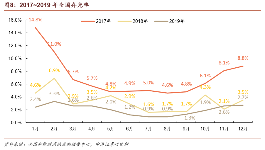 2019年我國棄風(fēng)、棄光率實現(xiàn)雙降,消納形勢繼續(xù)改善。全國平均棄光率為2%,同比下降1 pct。棄光率高于全國平均水平的省份有西藏(24.1%)、新疆(7.4%)、青海(7.2%)、甘肅(4.1%)、陜西(3.8%)、寧夏(3.4%),集中在我國西北地區(qū)。同期全國平均棄風(fēng)率為4%,同比下降3 pct。棄風(fēng)率高于全國平均水平的省份/地區(qū)有新疆(14%)、蒙西(9%)、甘肅(7.6%)、河北(4.8%