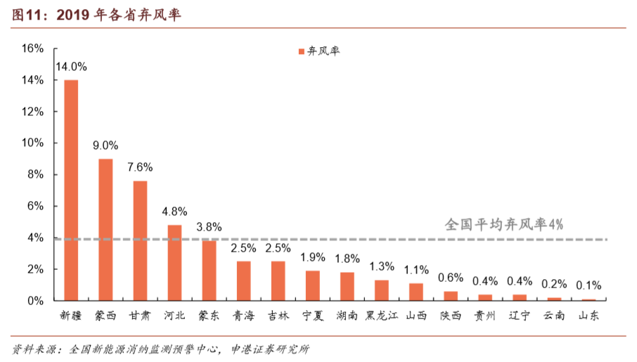 上一輪搶裝期過后,風(fēng)電場的并網(wǎng)需求遠(yuǎn)高于電網(wǎng)的消納能力,導(dǎo)致棄風(fēng)率在2016年達(dá)到高點。在風(fēng)電投資預(yù)警監(jiān)測機(jī)制的限制下,諸多已核準(zhǔn)項目陷入冷凍期。在經(jīng)歷了2015年15%、2016年17.1%的棄風(fēng)率高峰之后,棄風(fēng)率已連續(xù)三年實現(xiàn)下降,2019年實現(xiàn)棄風(fēng)率4%,同比降低3 pct,繼續(xù)保持即可滿足2020年棄風(fēng)率要求。